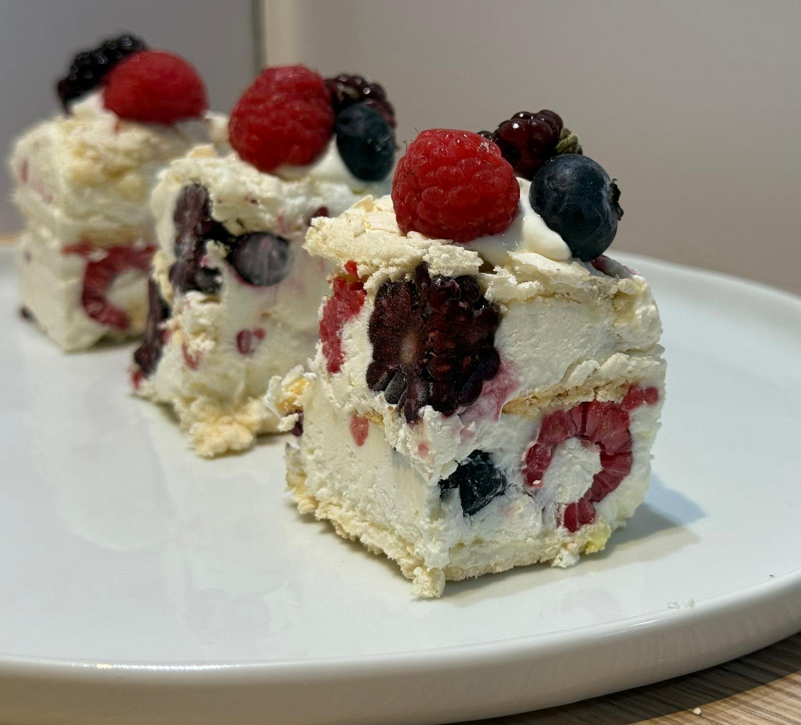 A light and crisp meringue shell with a soft marshmallow center, topped with delicate whipped cream and fresh fruit for a perfectly balanced, airy dessert