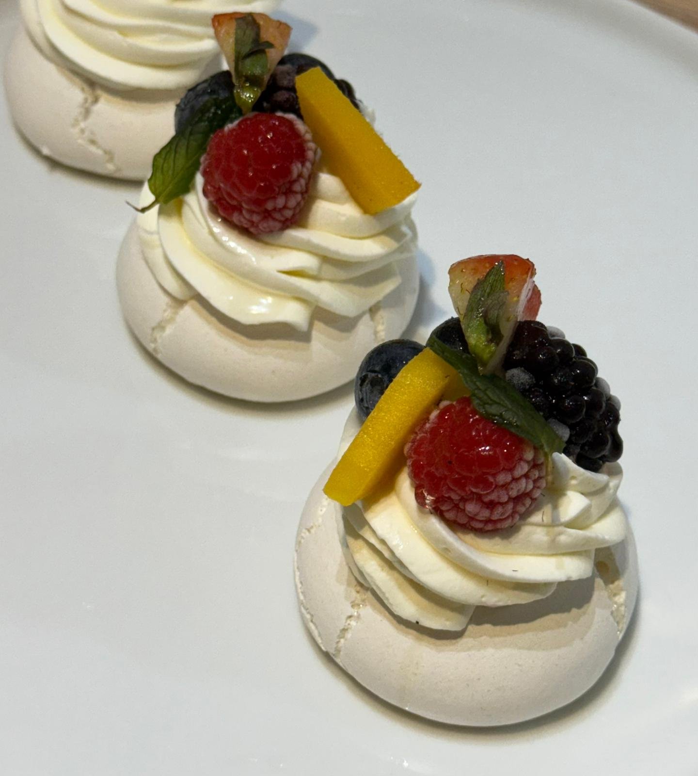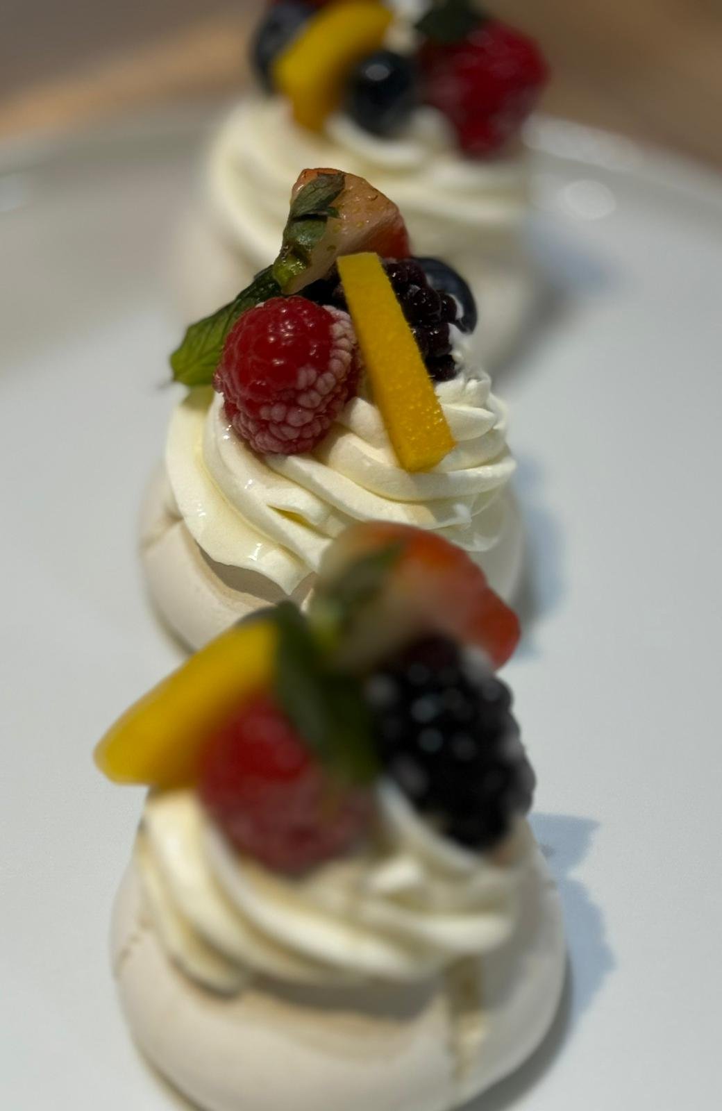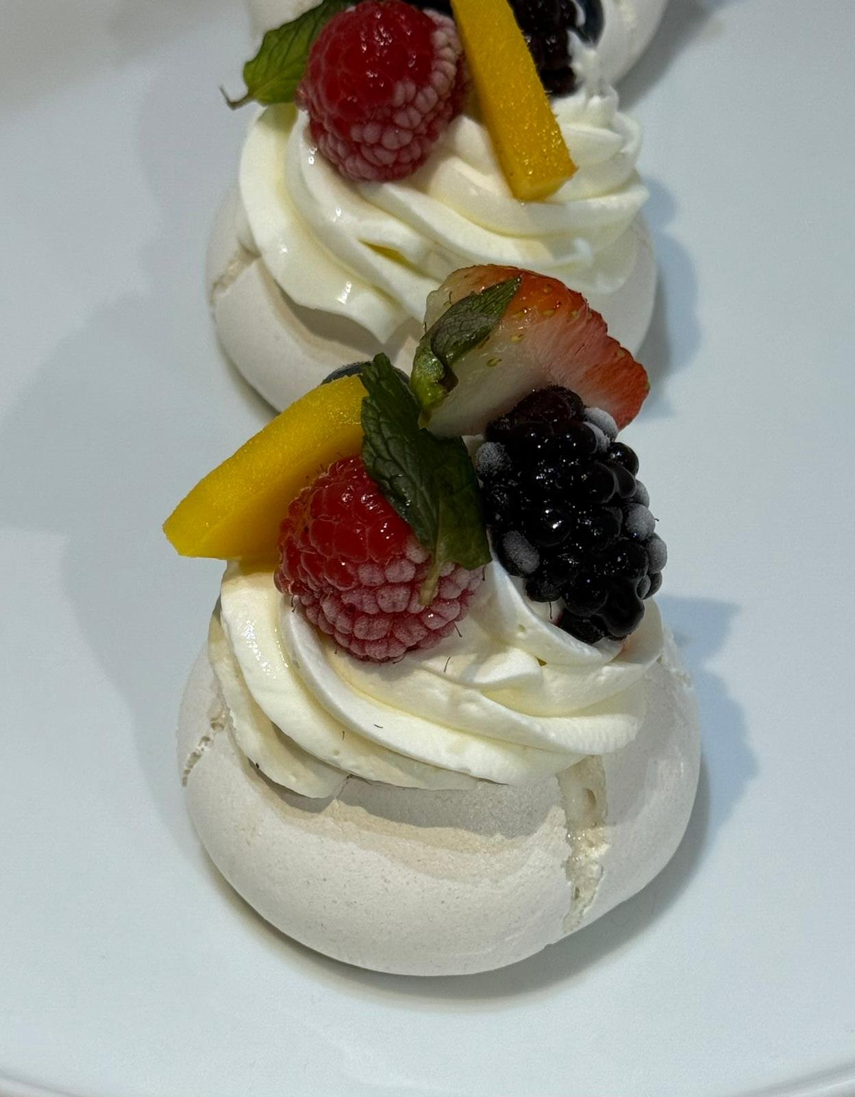 A light and crisp meringue shell with a soft marshmallow center, topped with delicate whipped cream and fresh fruit for a perfectly balanced, airy dessert