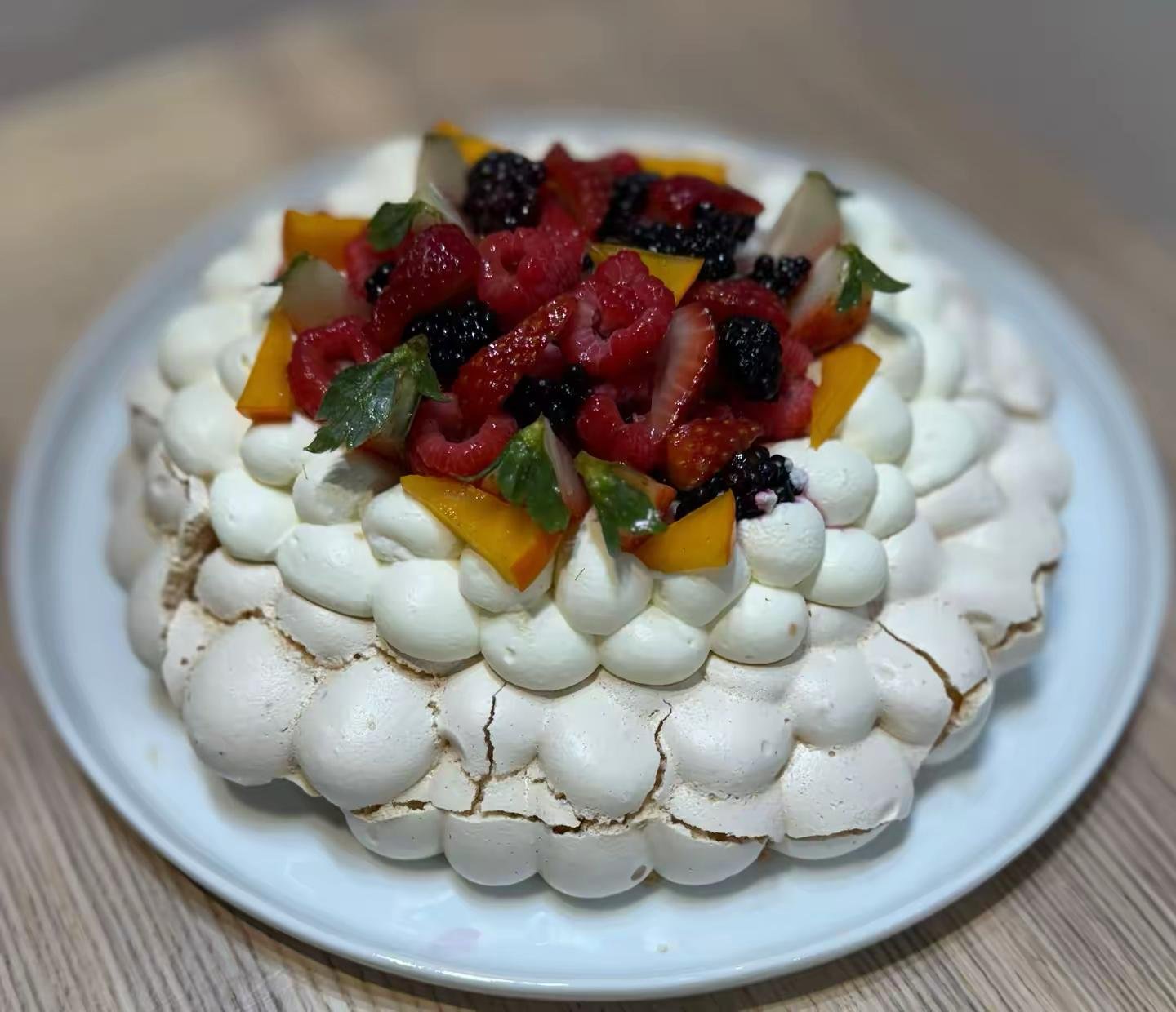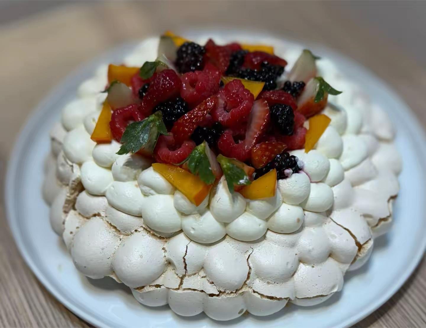 A light and crisp meringue shell with a soft marshmallow center, topped with delicate whipped cream and fresh fruit for a perfectly balanced, airy dessert