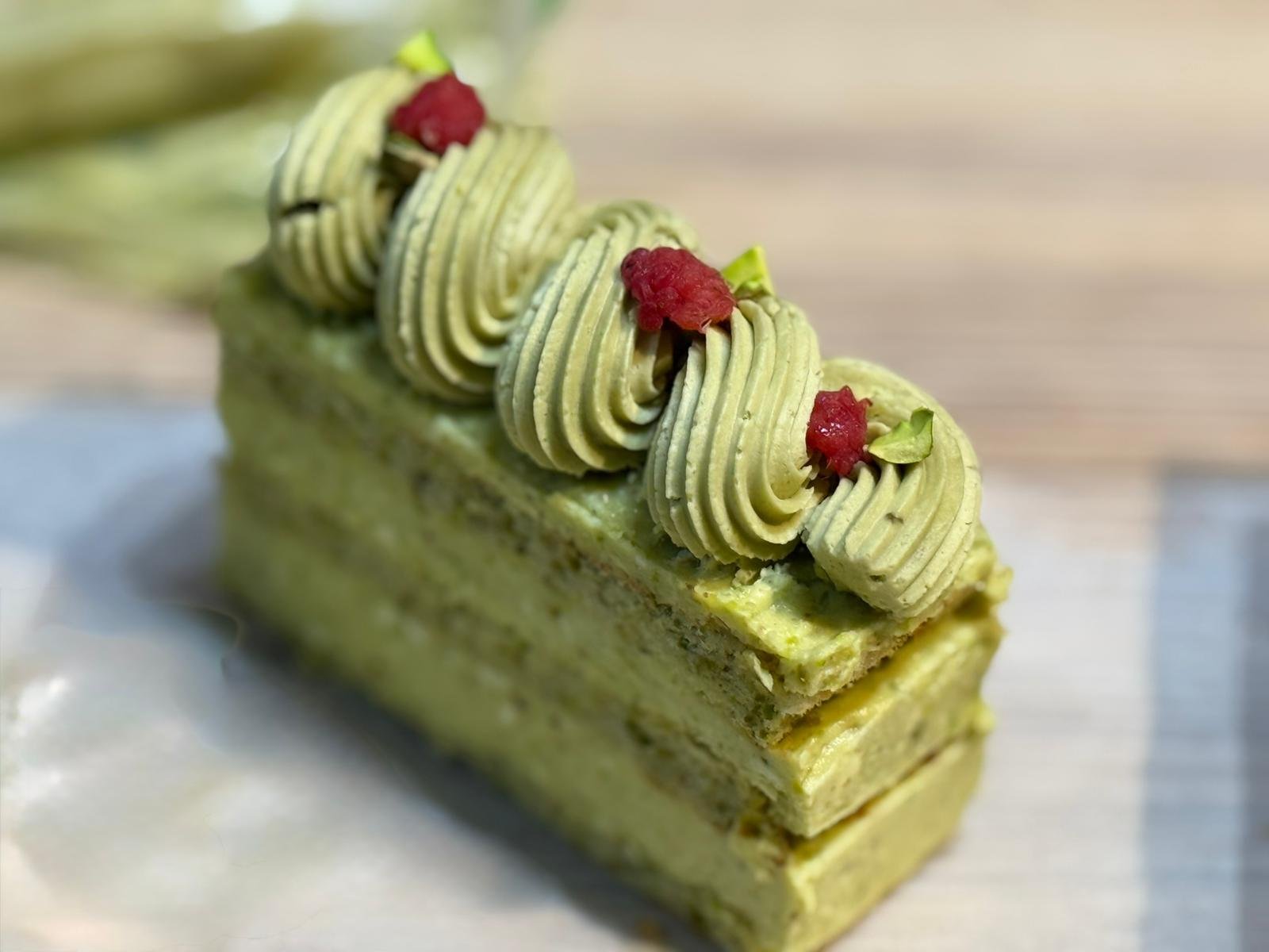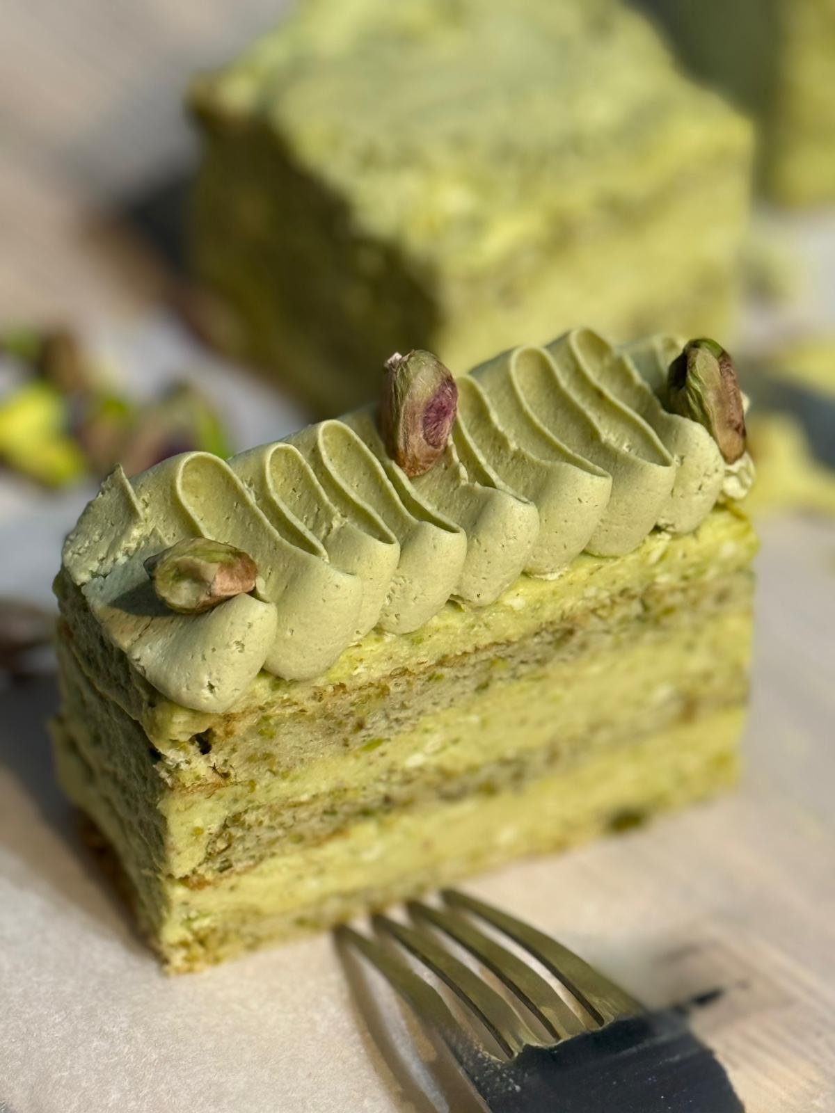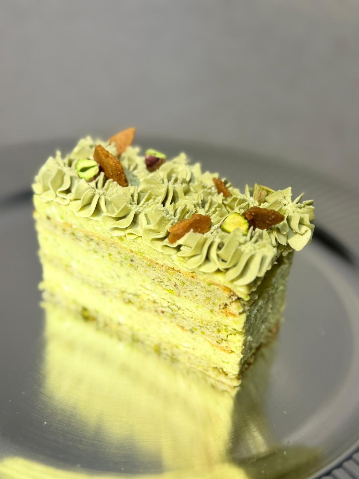 A soft and moist pistachio cake made with finely ground pistachios, giving it a naturally rich flavor and delicate green hue. Lightly sweet with a subtle nutty aroma, this cake has a tender crumb that melts in the mouth. Finished with a smooth pistachio cream, silky frosting, or a light glaze, it’s often garnished with crushed pistachios for extra texture. Elegant yet comforting, pistachio cake is perfect for special occasions or as a refined everyday dessert.
